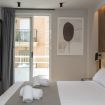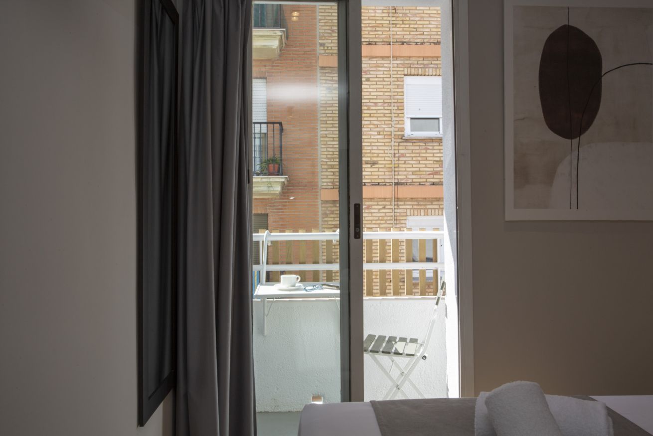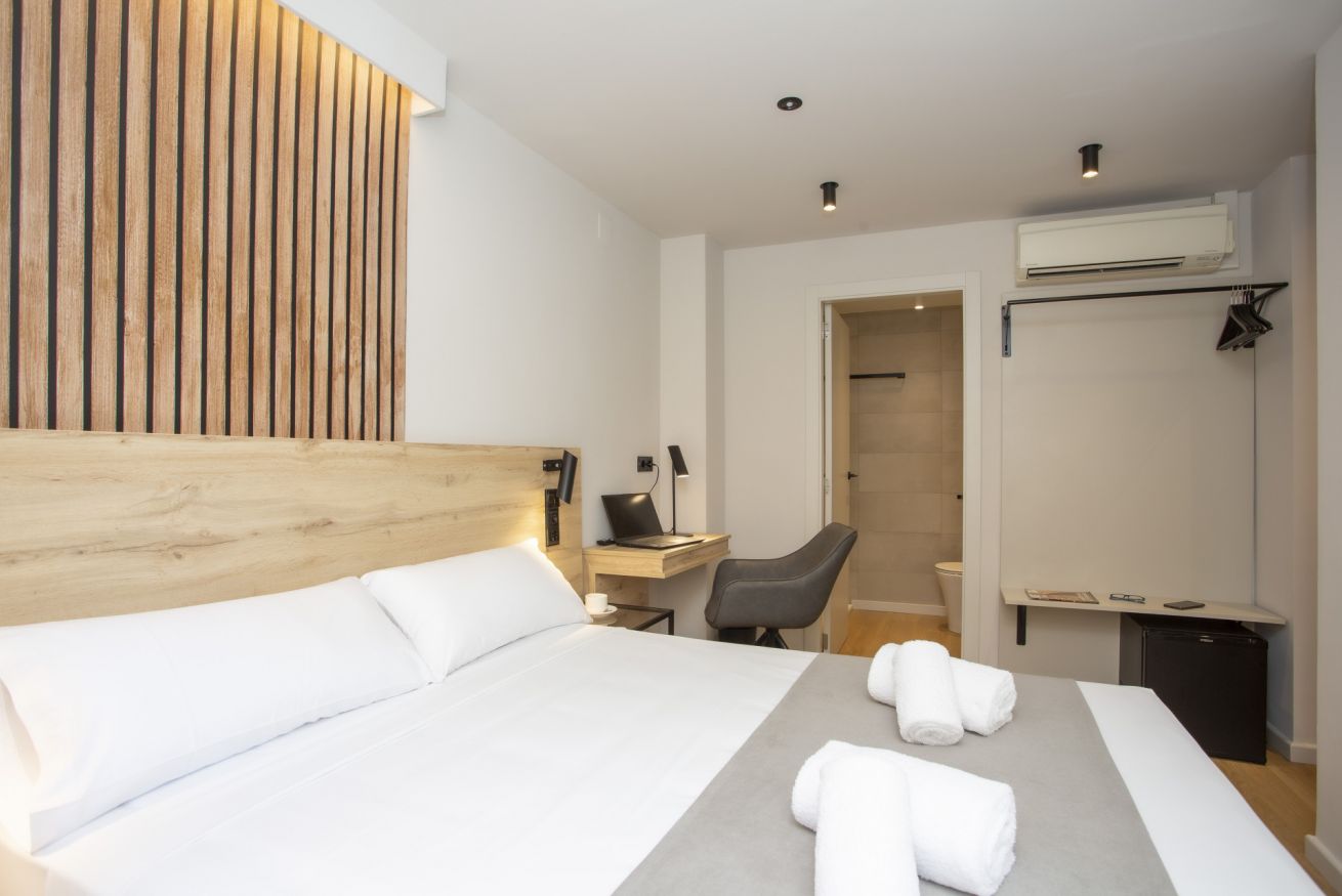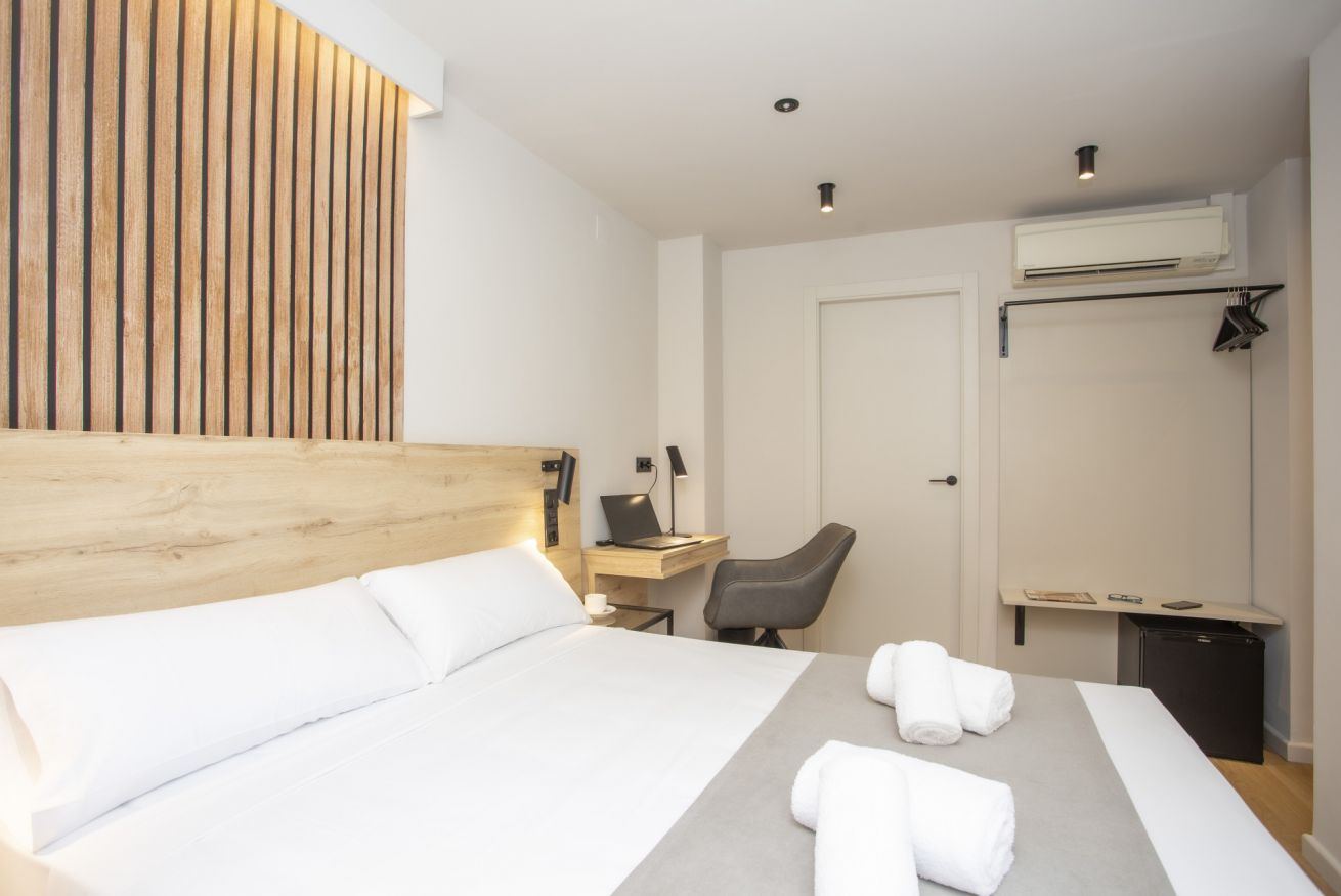 Es una habitación DOBLE 13m2, para 2 personas, está equipada con armario, TV de pantalla plana, baño privado, ropa de cama y toallas, además dispone de un balcón dando una luminosidad excepcional.